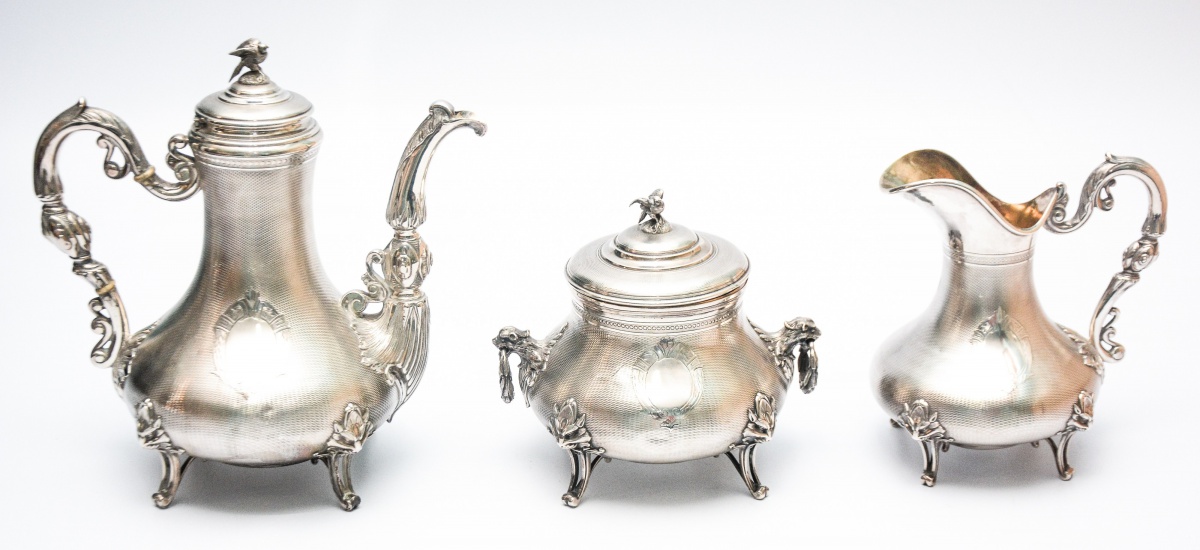 Elegante conjunto para café em prata francesa contraste “Cabeça de Minerva”, prateiro “Ferry”, Estilo “Art Nouveau”. Corpo guilhochado ricamente trabalhado. Pés vazados guarnecido com cabeça de leão. Composto de: Bule de café, leiteira e açucareiro. Bule: 25 cm. Peso: 1.950g.