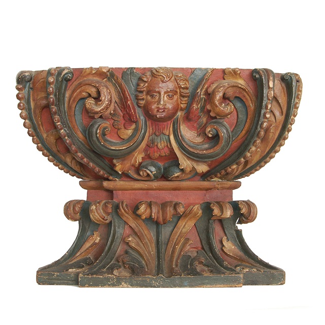 Grande peanha de madeira policromada de época barroca, composta por cabeça de anjo. Ricas volutas e godrões. Brasil. Séc. XVIII. 42 x 56 x 22 cm.