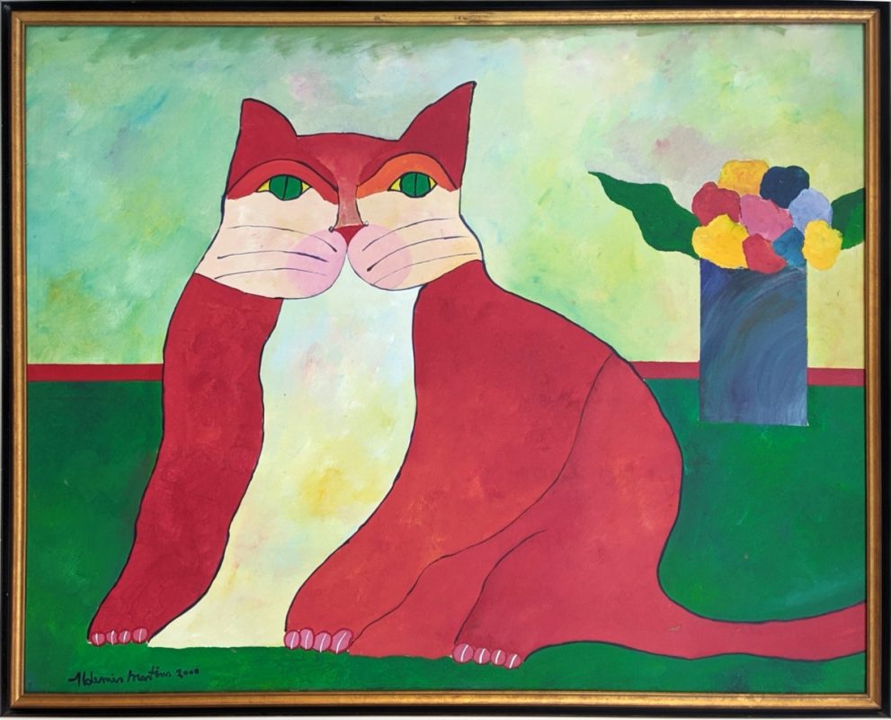 “Gato vermelho c/ vaso de flores”. Acrílico sobre tela. 80 x 100 cm. Assinado e datado (2000). Moldurado. Acompanha certificado de