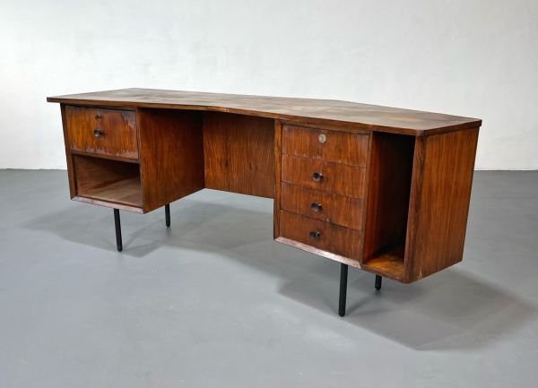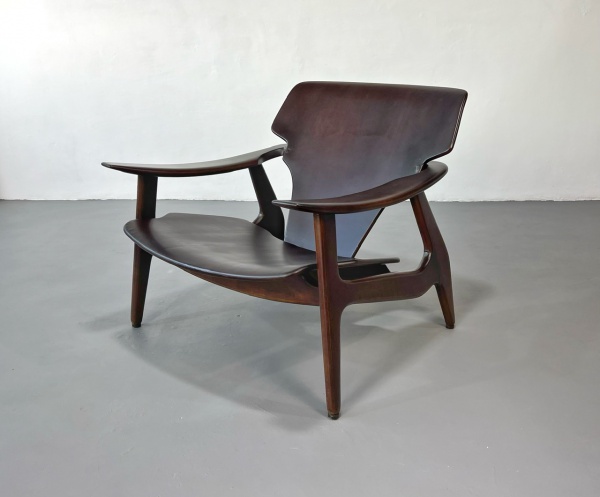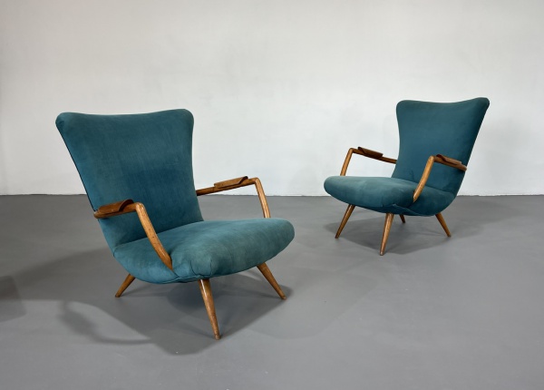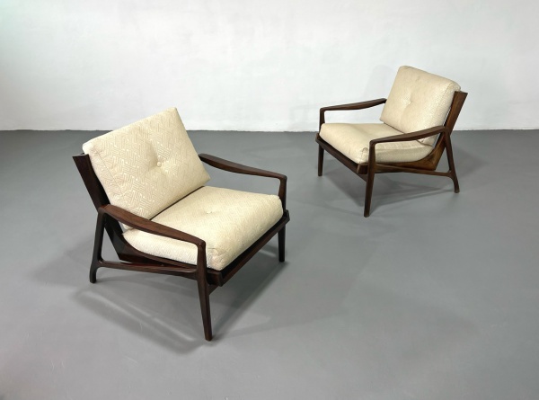 Giuseppe Scapinelli – Espetacular e raro par de poltronas em caviúna maciça e estofamento revestido em suede . Estrutura em bom estado de conservação tecido apresenta marcas de uso e peça preserva resquícios do selo de época. Brasil, C.1950 – 69x82x80H.