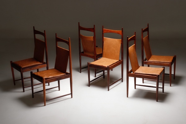 Sergio Rodrigues – OCA – Brasil, 1959 – Raríssimo e autêntico conjunto de seis magníficas cadeiras “Cantú Alta” com estrutura toda em jacarandá maciço e assento e encosto revertidos em couro.