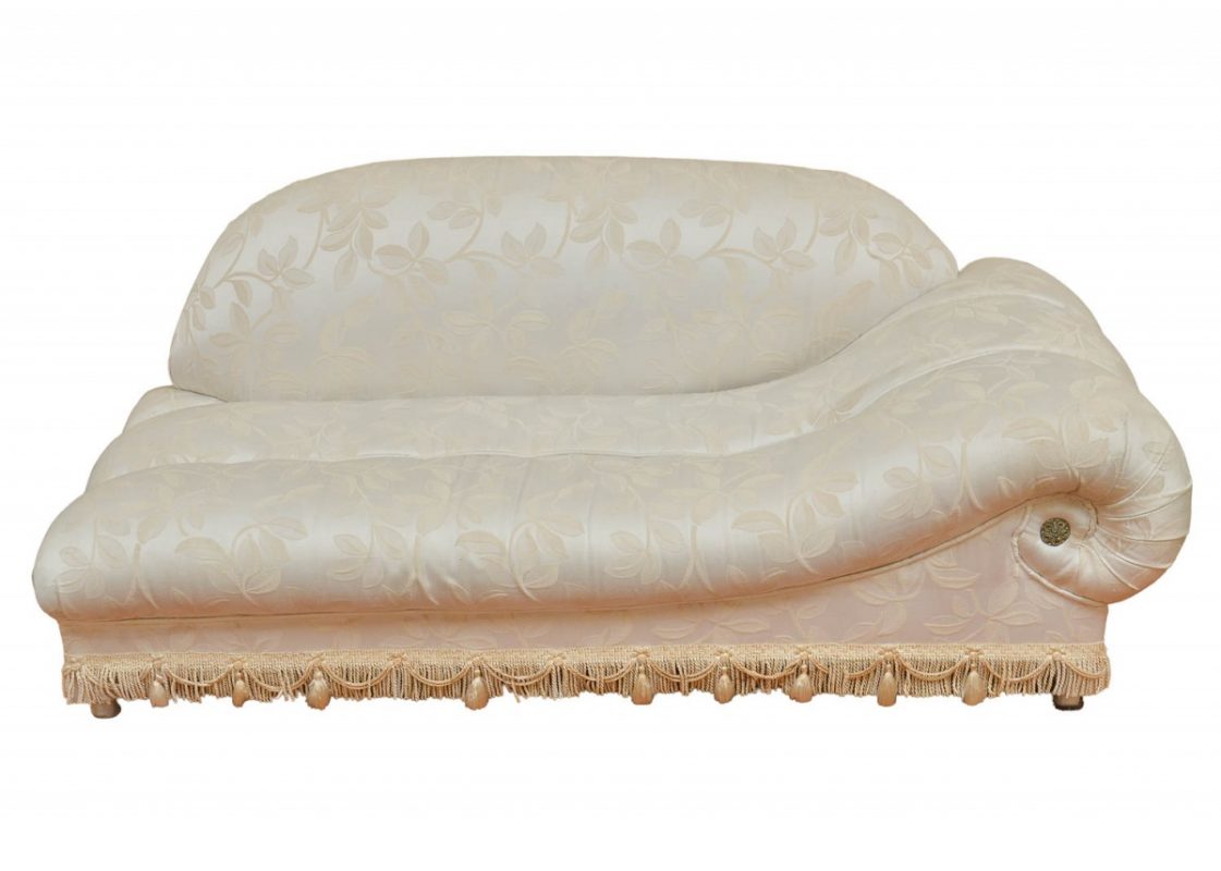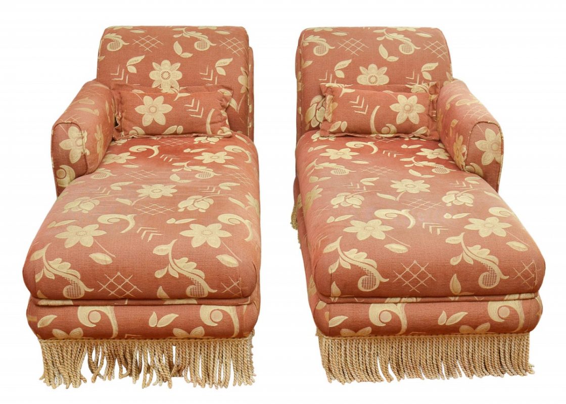 Par de elegantes chaises longues em estilo francês, estofamento em tecido de alta qualidade com padrão floral clássico em tons de creme sobre fundo terracota. Cada peça é adornada com uma franja decorativa em tom dourado na base. O design curvo e as almofadas complementares, garantem conforto e apoio. Estas chaises longues são um exemplar autêntico de mobília com inspiração francesa. 155x60x45 cm cada