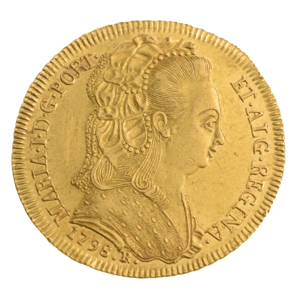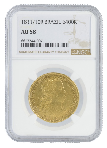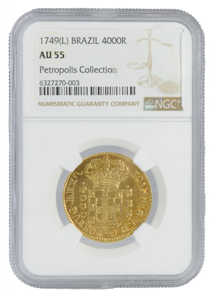 clique aqui para ver o loteMoeda do Brasil – 4.000 Réis – 1749 R – Rio – Colônia – D. Joao V – Ouro (.917) – 8,20 gr – Graduada pela NGC como AU 55 (Ex-Petropolis Collection) – Cat. AI O292