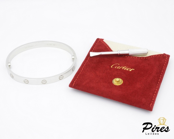 clique aqui para ver o loteCONDIÇÃO ESPECIAL: 3x SEM JUROS: CARTIER – Pulseira Love Ouro Branco 18K Modelo Tradicional, Fecho com Parafuso, inclui a chave de fendas, Largura 6.1mm, tamanho 17cm de comprimento, peso de 33,6 gramas. Acompanha certificado de garantia PIRES LEILÕES