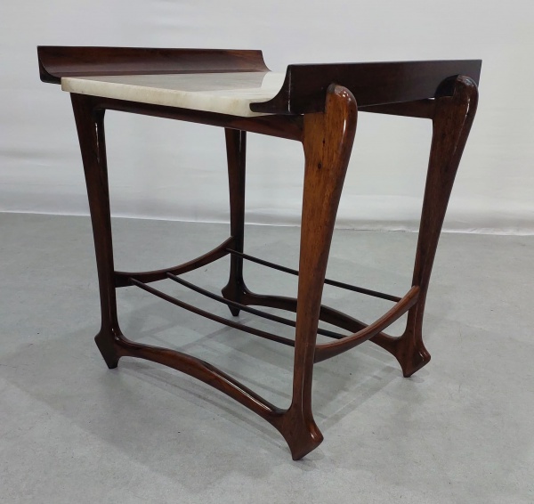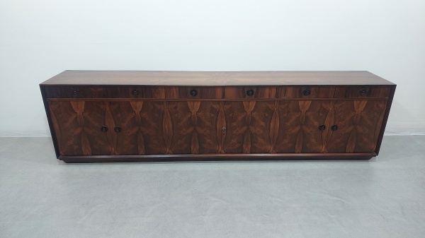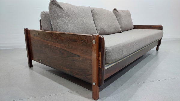 clique aqui para ver o loteSERGIO RODRIGUES/OCA (1927 – 2014) – Sofá Macedo, confeccionado em Jacarandá com partes maciças e partes folheadas. Parte de trás com prateleiras – Brasil, c 1960 – Medidas: Altura: 0,62 – Largura: 2,03,5 – Profundidade: 1,20.