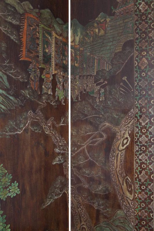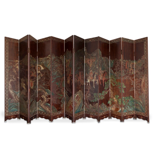 clique aqui para ver o loteGrande e importante biombo chinês Coromandel. Com 12 folhas, entalhadas em baixo relevo, laqueadas na tonalidade marrom e com fino trabalho de policromia. Decorado em um lado com figuras em cenas do cotidiano oriental e paisagem montanhosa no outro.