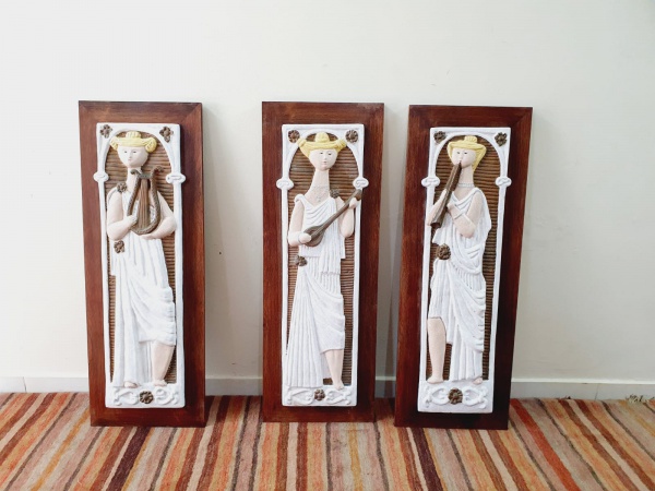 Angelo Taccari – Novo Rumo – Trio de placas decorativas em Jacarandá e esculturas em cerâmica. Medidas: 34cm comprimento X 95cm altura x 4cm largura (espessura).