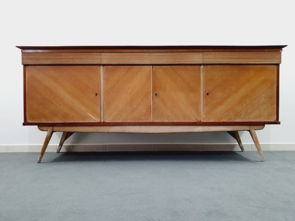 Buffet com tampo e laterais em caviúna e portas em Marfim, com 4 portas e 3 gavetar grandes. Medidas: 205cm comprimento X 49cm largura X 90,5cm altura.