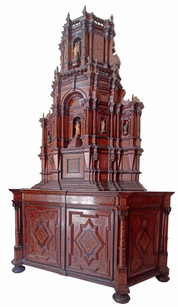 clique aqui para ver o loteExcepcional móvel de igreja Altar de Sacristia Firenze , destacando-se grande trabalho na madeira, com detalhes de marchetaria e nichos, balaústre, colunas com capiteis coríntios, parte de baixo duas portas centrais com as ferragens originais da época, e duas gavetas grandes frontais, duas gavetas secretas dos lados, parte de cima frontal duas porta segredo, sendo uma delas, com uma figura de bronze com ouro ormolu, continuando para cima tem mais uma escultura, completando um total de 4 figuras de bronze, com a mesma qualidade excepcional; De acordo as informações do proprietário, ele veio da Itália para brasil em barco.