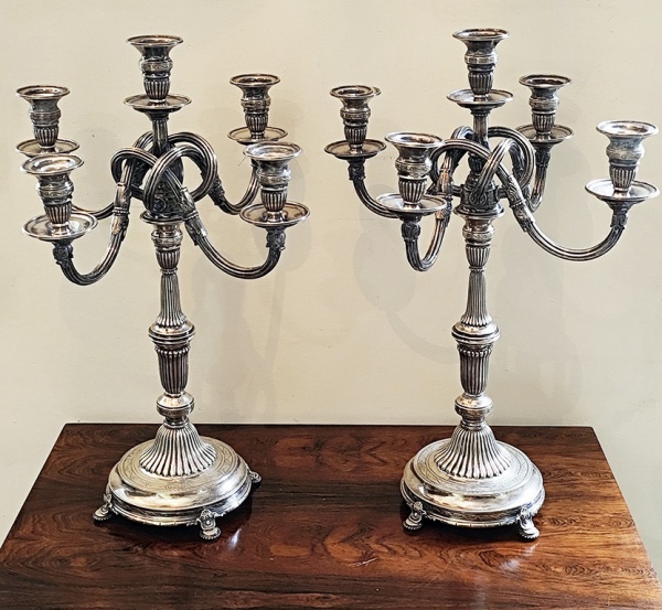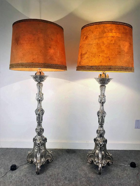 IMPONENTES E EXCEPCIONAIS,Par de tocheiros em prata de lei brasileira, finais do século XIX / início do século XX, posteriormente adaptados para luminárias c. 19201940. Corpos ricamente cinzelados com decoração vegetalista e volutas de inspiração barroca, colunas compostas por diversos registros ornamentados e bases trípodes recortadas com cartelas e elementos em relevo.