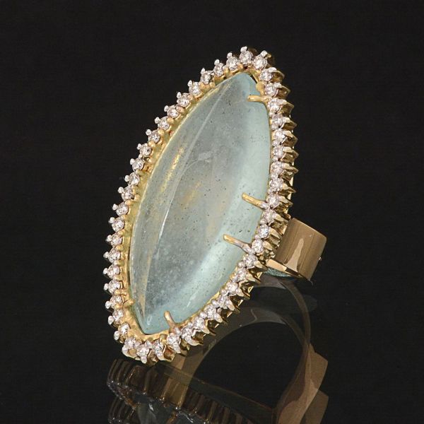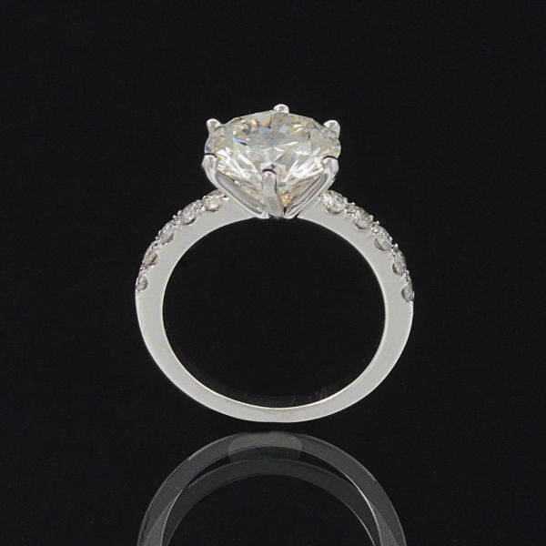 Anel em ouro branco 18 k, com diamante central de aproximadamente 4,06 ct. Grau de pureza SI-1. Cor J. Lapidação redondo e brilhante. Aro 16/17. Total aproximado em diamantes 4,55 ct. Acompanha certificado do Laboratório Gemológico da Ajorio.