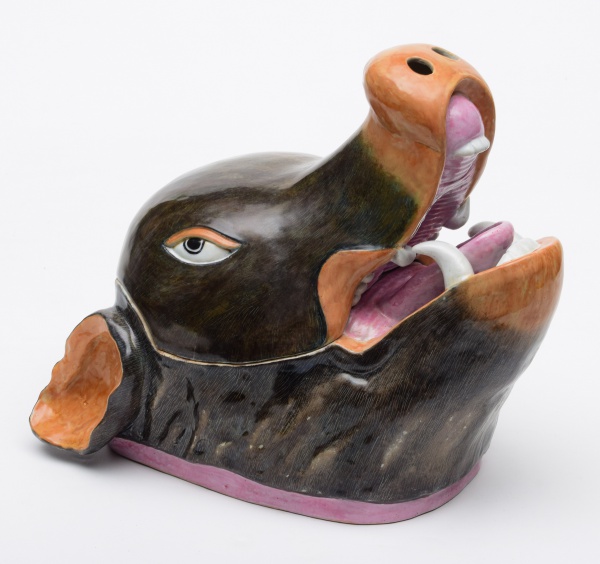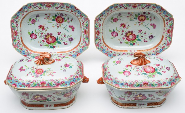 Par de terrinas (sopeiras) em porcelana chinesa, Cia das Indias, Dinastia Qing, período Qianlong (1736-1795), Família Rosa. Acompanham suas respectivas travessaa. Uma das peças com restauro em parte do corpo. Medidas das terrinas: 30 x 23 cm .Altura: 23 cm. Medidas das travessas: 37 x 29 cm.