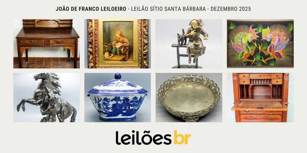 O João de Franco Leiloeiro fará nos dias 1, 2 e 3 de Dezembro, às 19h, o seu Leilão Sítio Santa Bárbara, com um total de 679 lotes. Mais informações abaixo!!! Destacamos alguns dos destaques deste leilão, clique nas imagens para ir diretamente a peça. EXPOSIÇÃO Exposição somente online! Nos dias 1, 2 e 3 de […]