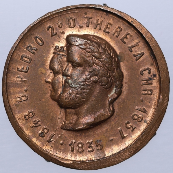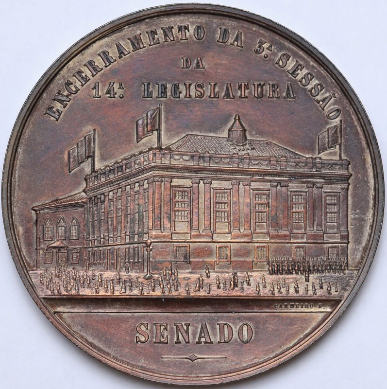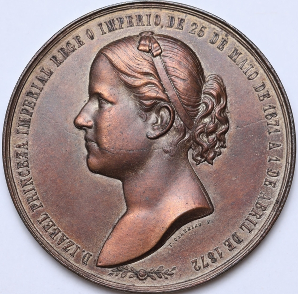 clique aqui para ver o loteMedalha do Brasil – 1872 – Encerramento da 3ª sessão da 14º Legislatura do Senado – 2º ensaio, variante de legenda e busto: D. Izabel Princeza Imperial rege o Império, de 25 de maio de 1871 a 1 de abril de 1872 – Busto com cabelos presos – Artista: Carneiro – Cobre – 61 mm – VC-55 e JM-42