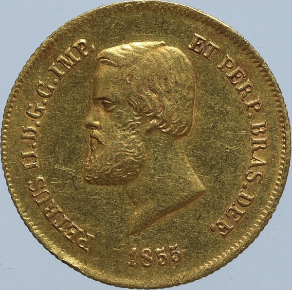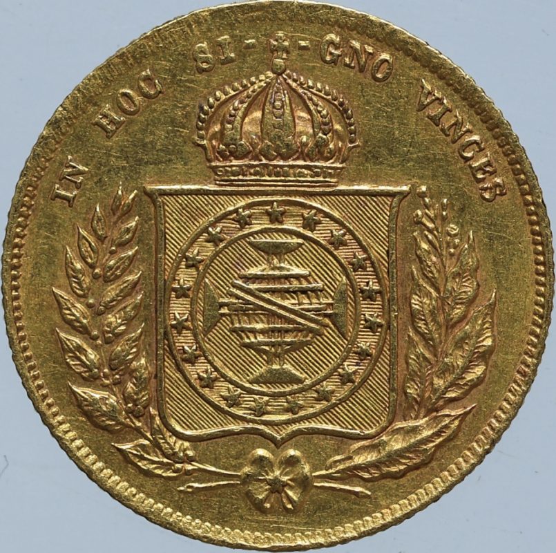 clique aqui para ver o loteMoeda do Brasil – 5000 réis – 1855 – OURO (.917) – 4.4 g – 19 mm – O638 – Coroa de Espinhos – Império