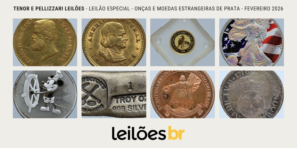 A Tenor e Pellizzari Leilões realizará no dia 14 de Fevereiro, às 19h, o seu Leilão Especial – ONÇAS E MOEDAS ESTRANGEIRAS DE PRATA, com um total de 293 lotes.