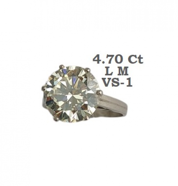 clique aqui para ver o loteBelíssimo solitário em platina com excepcional diamante, lapidação completa dita brilhante com aproximadamente 4.70ct. Cor L M. Pureza VS-1. Aro 14. Peso total 4.6g. Este item não se encontra no local do leilão.