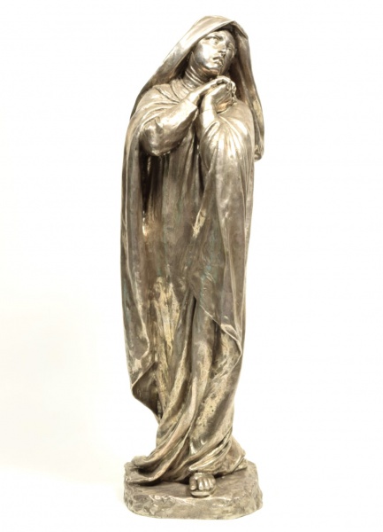 clique aqui para ver o loteExtraordinária imagem europeia de Nossa Senhora, toda confeccionada em prata de lei. Assinada na base, assinatura ilegível. Med. alt 65 cm, 20 cm diâm. da base. Peso da prata 9.770 gr.